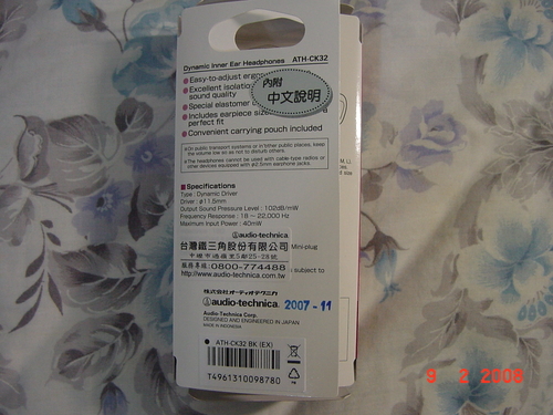 鐵三角ATH-CK32 作者: zx 發佈日期: 2008 年 2 月 10 日 買到這支小鐵 似乎是新代理的 早期是"十全"…這支是"台灣鐵三角" 新的代理商 附收藏袋…印有小鐵的logo ^^ 傳說中的..束線帶反折…非常貼心 目前還沒RUN開 聲音還不知道會不會像網路說的一樣 =口= 第2支小鐵…這次打算邊聽邊RUN…^o^ 分類:電腦開箱